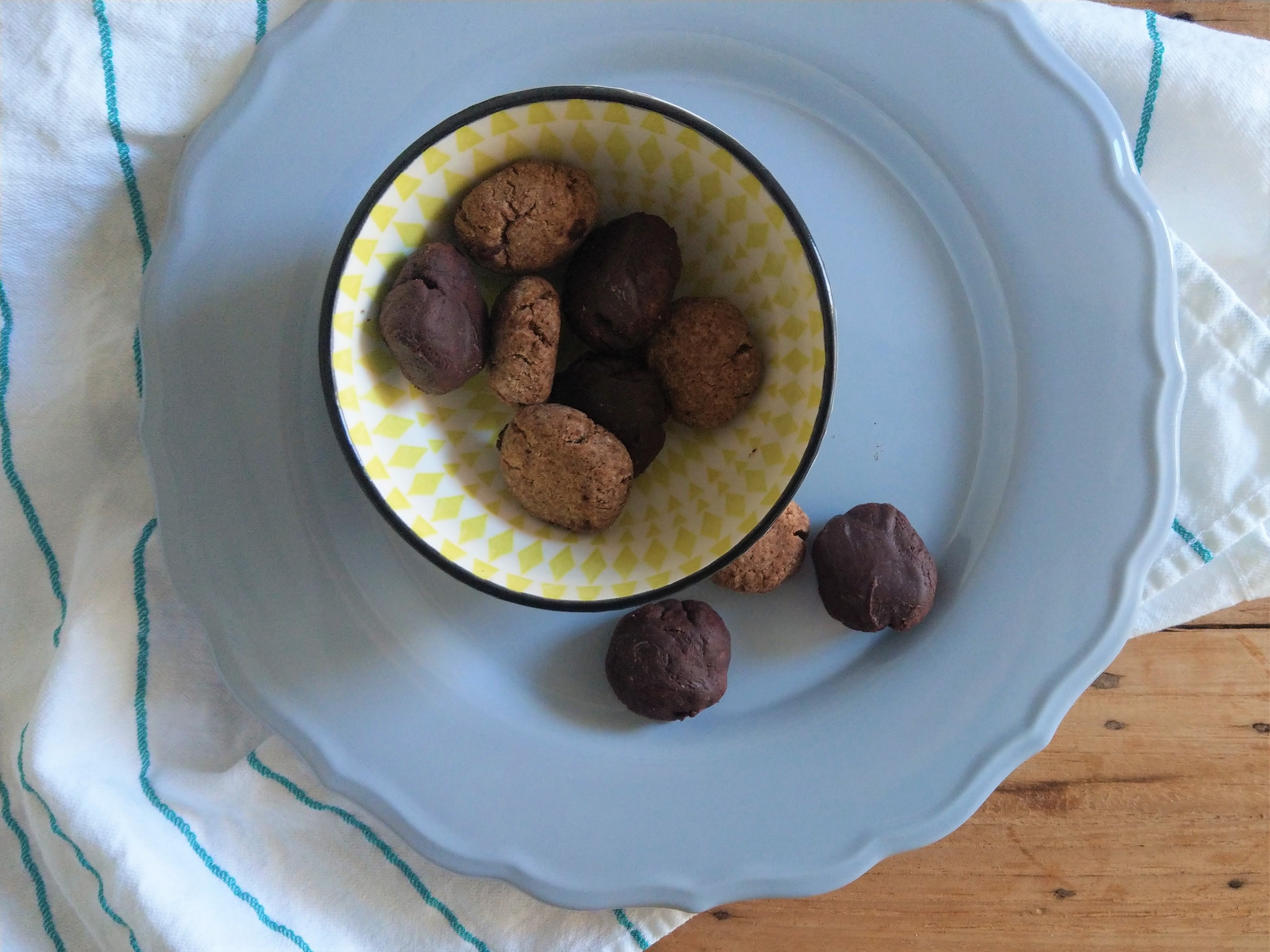 - Rol kleine balletjes van het deeg en druk een beetje plat op de bakplaat. Schuif voor 20-25 minuten in de oven. Ze moeten net een beetje bruin beginnen te kleuren aan de randjes.