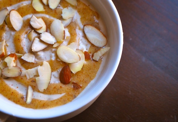 6. Serveer de havermout met 1/3 van de amandelcrème per portie en wat extra geschaafde amandelen. Zo houd je nog 1 portie over voor je ontbijt van morgen.