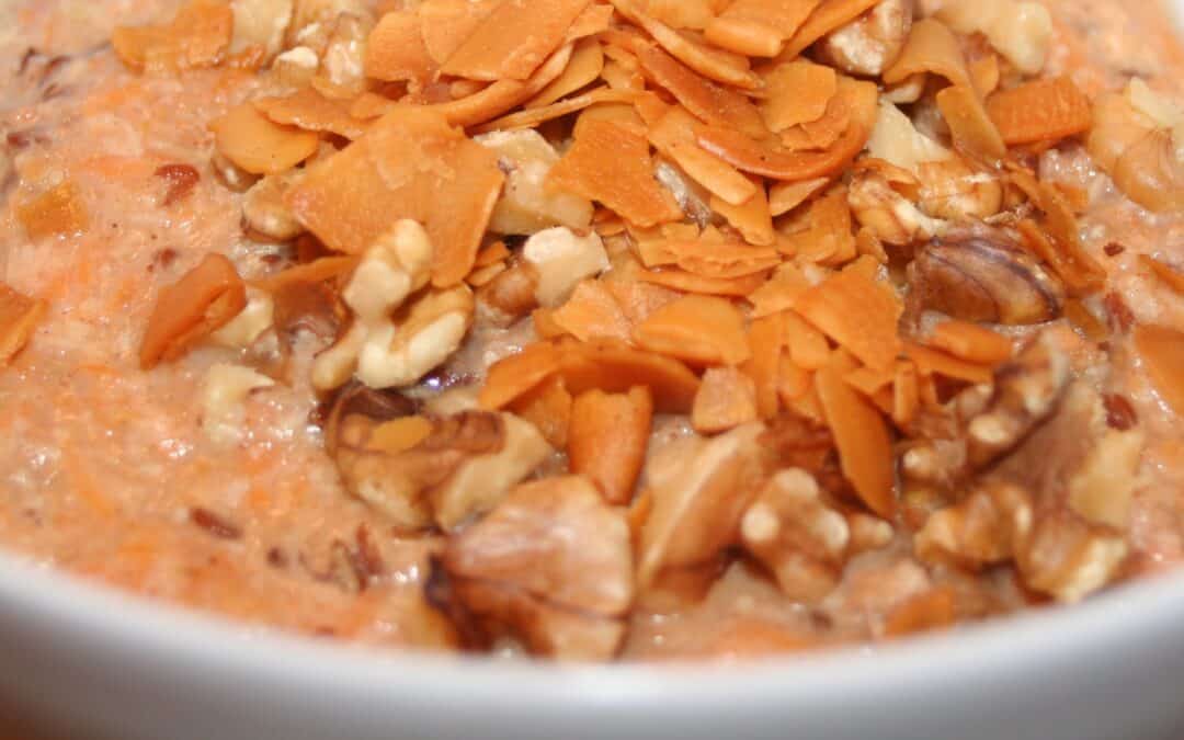 Ik ben echt gek op carrotcake! Vooral met zo’n dikke laag witte, romige frosting en die super lekkere koek- en speculaaskruiden (in Amerika noemen ze die ‘pumpkin spices’). Dat maakt de kou en de regen een beetje minder erg.. 🙂 Hoewel er natuurlijk wortels zitten in carrot cake, is het door alle suiker en tarwe niet bepaald gezond. Daarom heb ik dit ontbijtje bedacht, zo kun je toch genieten van de smaak van carrot cake en eet je tegelijkertijd een voedzaam ontbijt. Mèt alvast je eerste portie groenten van de dag!