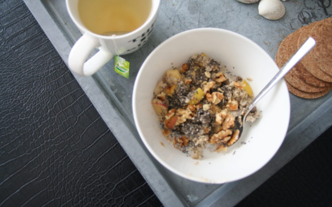 Snij de appel in kleine stukjes, bestrooi ze met kaneel en bak ze in je steelpannetje lichtbruin in wat kokosolie, voeg later de rozijntjes toe. Klop ondertussen de eieren los met een scheutje kokosmelk, zout en stevia. Als de appeltjes lekker beginnen te karamelliseren, voeg dan je ei toe en roer regelmatig om, net als je bij een roerei zou doen. Als je ei gaar is, doe alles dan in een diepe kom. Giet er nog een scheutje kokosmelk bij en maak af met wat extra kaneel, het chiazaad en de walnoten.